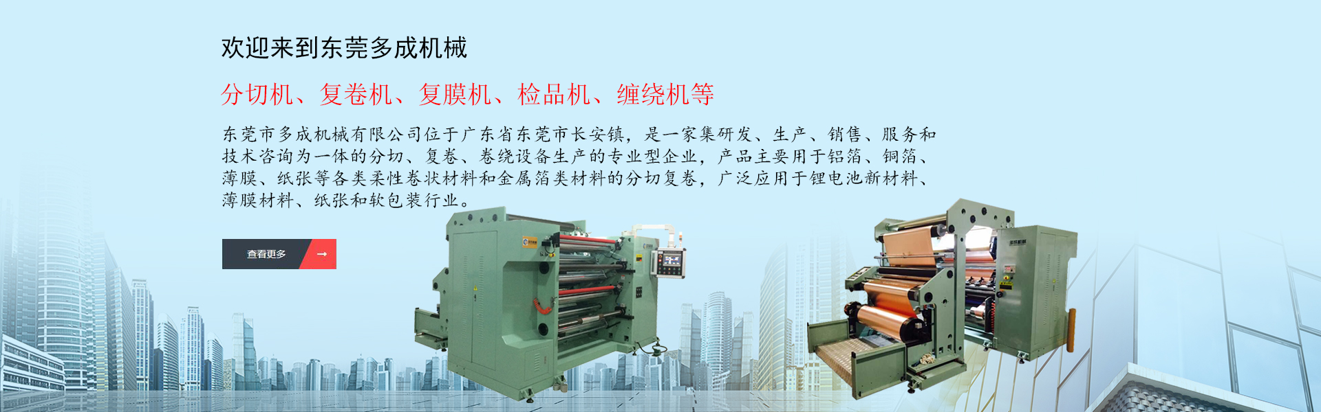 東莞市多成機械有限公司位于廣東省東莞市長安鎮,是一家集研發(fā)、生產、銷售、服務和技術咨詢?yōu)橐惑w的分切、復卷、卷繞設備生產的專業型企業,產品主要用于鋁箔、銅箔、薄膜、紙張等各類柔性卷狀材料和金屬箔類材料的分切復卷,廣泛應用于鋰電池新材料、薄膜材料、紙張和軟包裝行業,產品范圍有分切機、復卷機、復膜機、檢品機、纏繞機等,是國內外分切卷繞設備專業供應商。